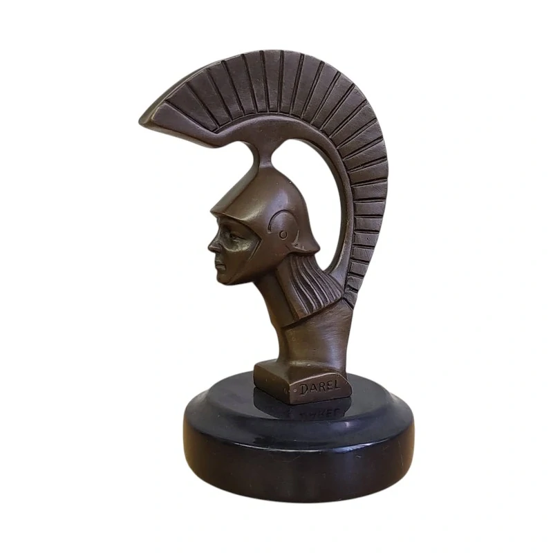 Art Deco bronzová soška – poprsí spartského válečníka (Spartan, Sparta), antická helma, Georges Darel