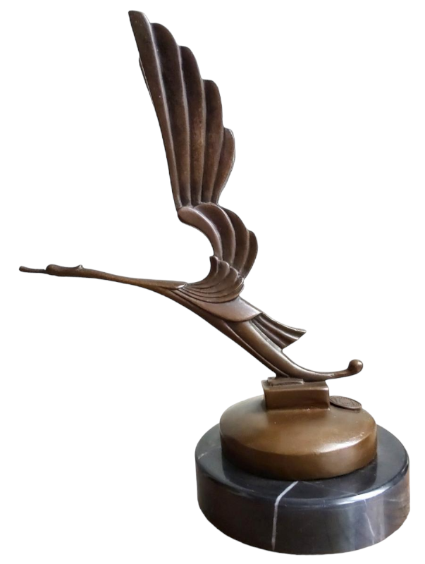 - Čáp bílý – Flying Stork Mascot, bronzová soška ve stylu Lalique, luxusní umělecká dekorace