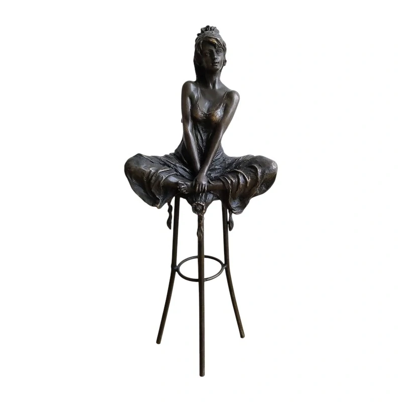- Elegantní bronzová socha sedící ženy na barové stoličce