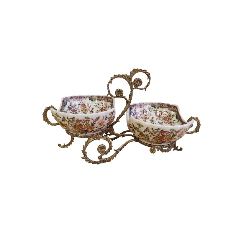 Elegantní dvoumiskový stojan s jemným květinovým motivem.