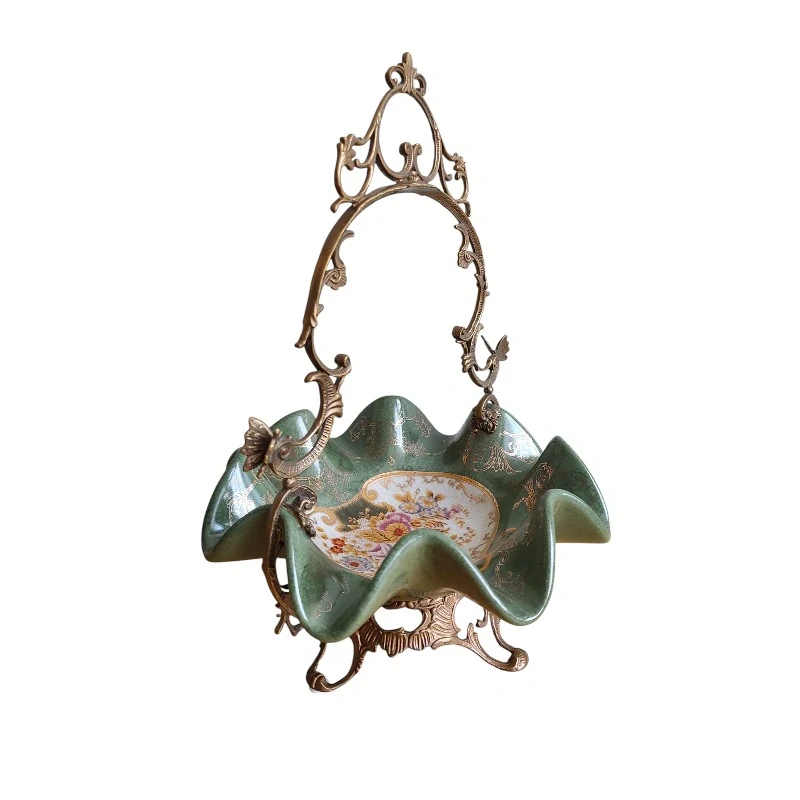 Dekorativní porcelánový košíček s bronzovým držadlem – zelená luxusní interiérová dekorace