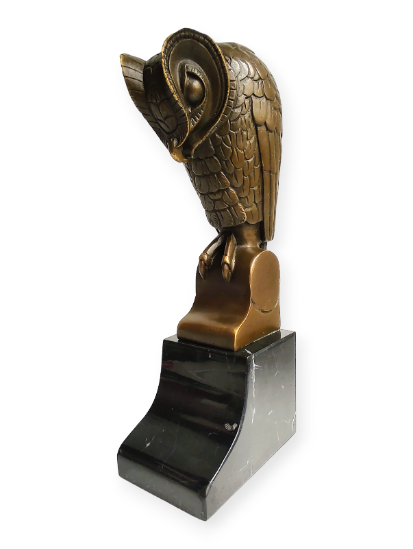- Art Deco bronzová socha sovy na mramorovém podstavci – podle Mendese da Costy, elegantní umělecká dekorace