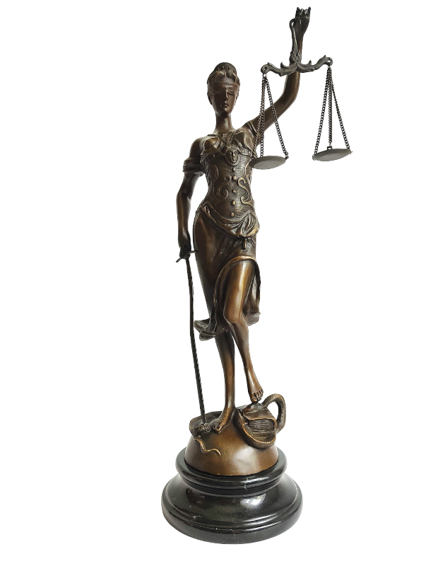 Vynikající bronzová socha bohyně spravedlnosti Temidy. Je dokonale a precizně ztvárněna v
