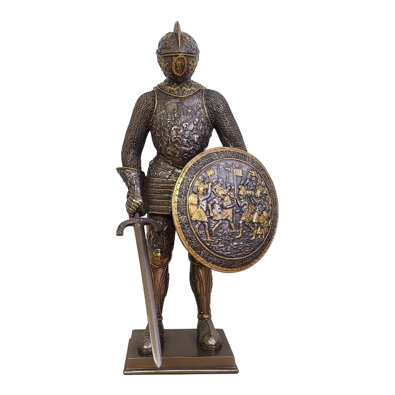 Detailně zpracovaná soška středověkého rytíře se štítem a mečem představuje působivý